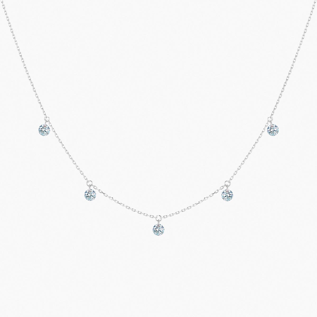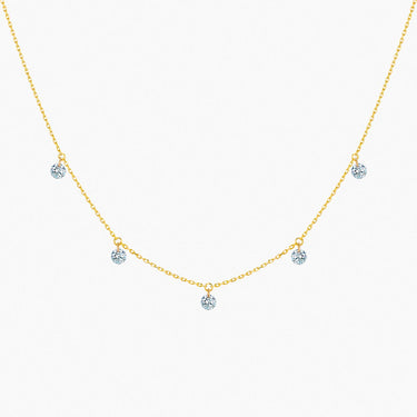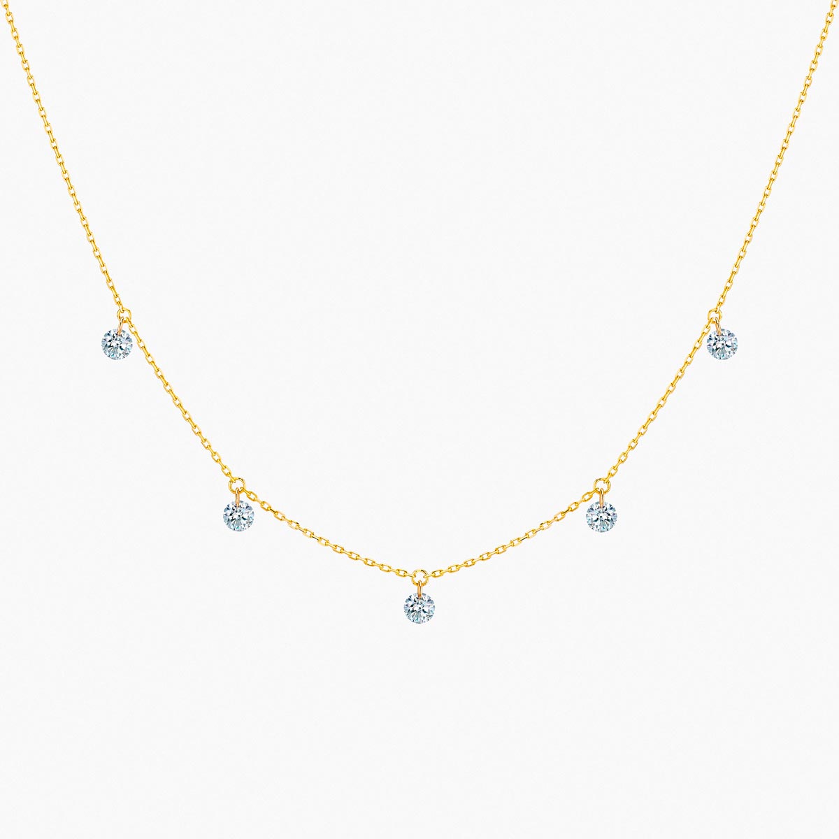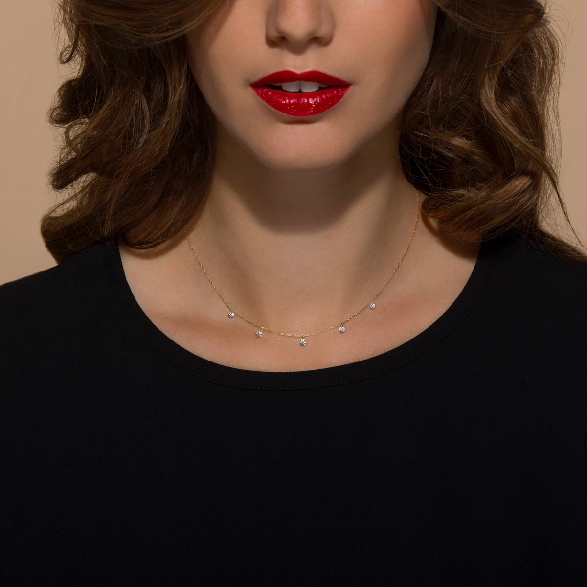 Along a fine, luminous and pure chain of faceted white, yellow or pink gold, 5 diamonds, "naked" of any setting, 0.10 carat each, gently sway to your movements, sparkling and luminous.