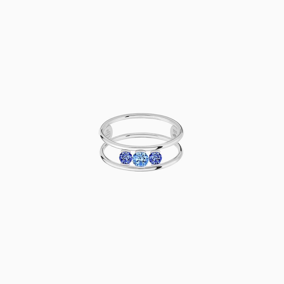 Two white gold rings set with a trio of sky-blue and deep-blue sapphires weighing a total of 0.45 carats.