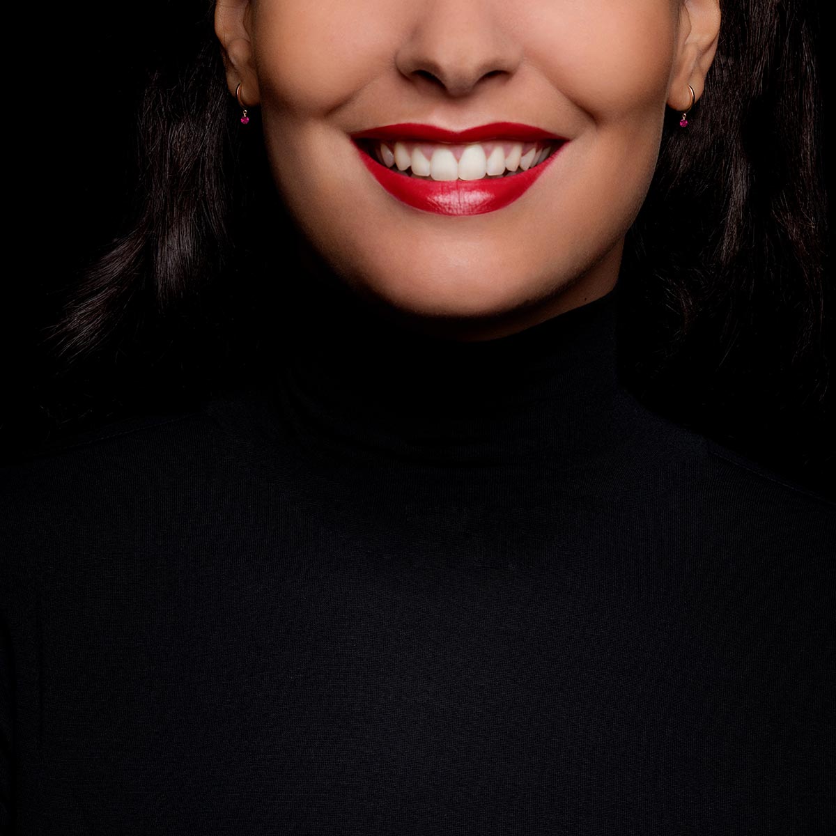 Sus rubíes rojo pasión perfectamente colocados, de 0,15 quilates cada uno, suspendidos bajo su lóbulo, encenderán cada uno de sus movimientos.