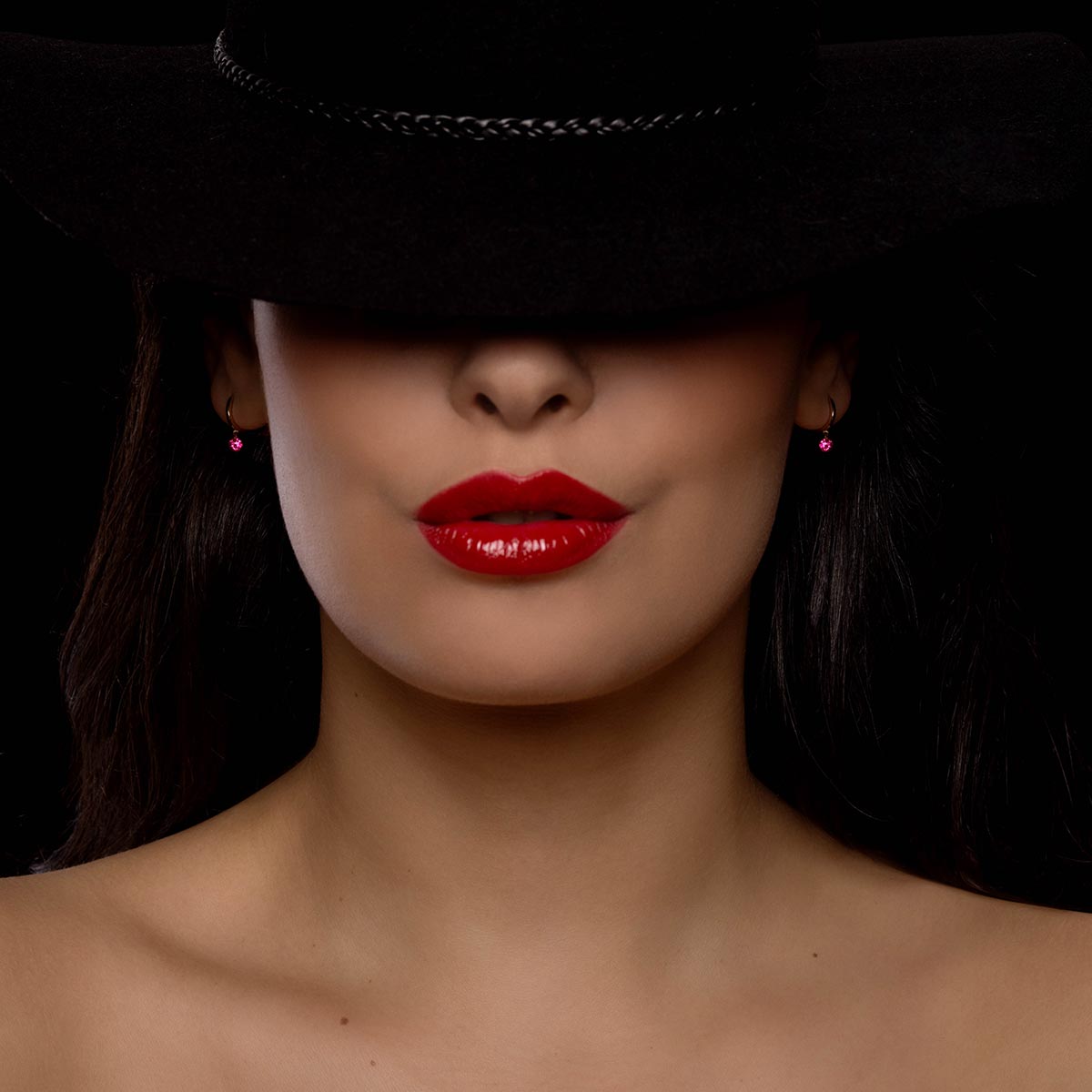 Sus rubíes rojo pasión perfectamente colocados, de 0,30 quilates cada uno, suspendidos bajo su lóbulo, encenderán cada uno de sus movimientos.