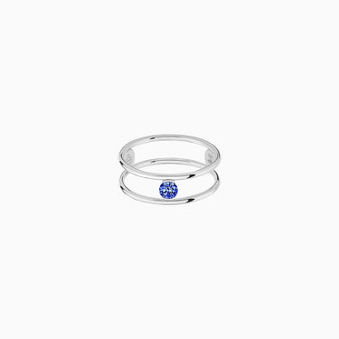 Este anillo HULA HOOP, inspirado en los aros de nuestra infancia, presenta dos aros de oro blanco delicadamente unidos por un zafiro azul de 0,23 quilates.