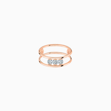 Deux anneaux d’or blanc, jaune ou rose, symboliquement unis par trois diamants de 0,10 carat chacun.